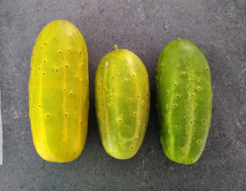 Sown in late April without soaking seeds. Excellent germination (>90%). Plants are not demanding and grow easily. Produces well, but a bit hard to use due to their shape and large proportion of seeds. However, taste is excellent and importantly, they do not become bitter when yellow (zero bitter cucumbers over two years). Seed saving was successful.